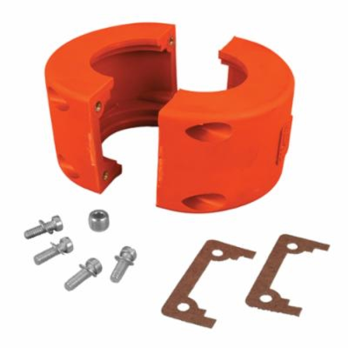 Covers fit taper bushed, QD and stock and finished bore couplings. Covers allow excellent lubrication and their use is recommended to obtain maximum coupling life. Covers are of aluminum and are made in halves for easy installation. Synthetic rubber oil seals, which contact the coupling hubs, retain the lubricant and prevent the entry of dirt. Covers are fitted with gaskets between the halves.