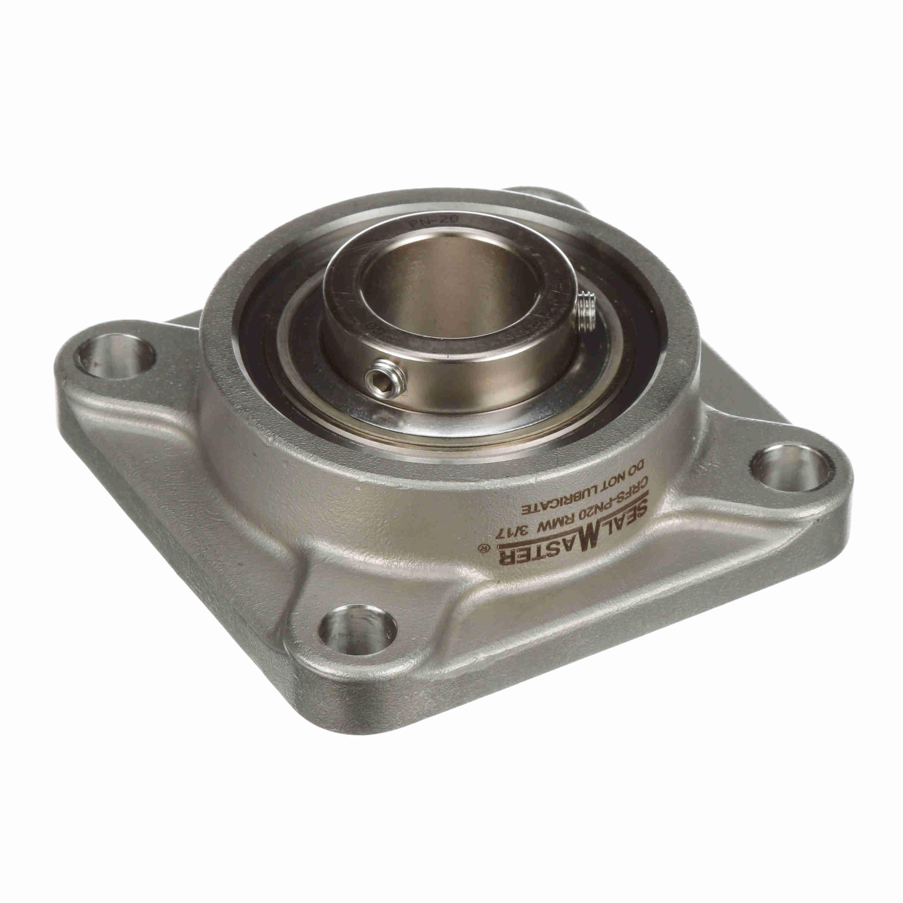 Sealmaster® Ball Bearing Unit, Non-Expansion Standard-Duty Round/Straight Bore, Series: CRFS-PN, 1-1/4 in Bore, 3-5/8 in Bolt Center-to-Center Length, 4-Bolt Flange Mounting, 4-5/8 in Overall Length/Diameter, 2-27/64 in Overall Depth, 4-5/8 in Overall Height, Set Screw Locking Device, 52100 Steel Bearing, FKM Seal, 5782 lb Dynamic Load, 2000 rpm Maximum, 250 deg F, Phosphorus Nickel Plated