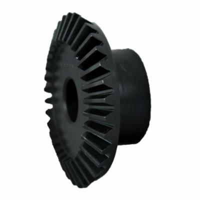 Bevel gears are used as right angle drives where high efficiency is required. They are carried in stock as 1:1 to 6:1 ratios. Bevel gears are cut with the long and short addendum system and 20 deg pressure angle to compensate for tooth undercut in gears and pinions having low numbers of teeth. Most all of Martin bevel gears are cut with the coniflex tooth form to allow for a slight misalignment at assembly and during operation. Gears should be mounted at the correct distance from the core of apex center with thrust bearings being used in back of hubs to absorb the backward thrust created in this type of gearing.