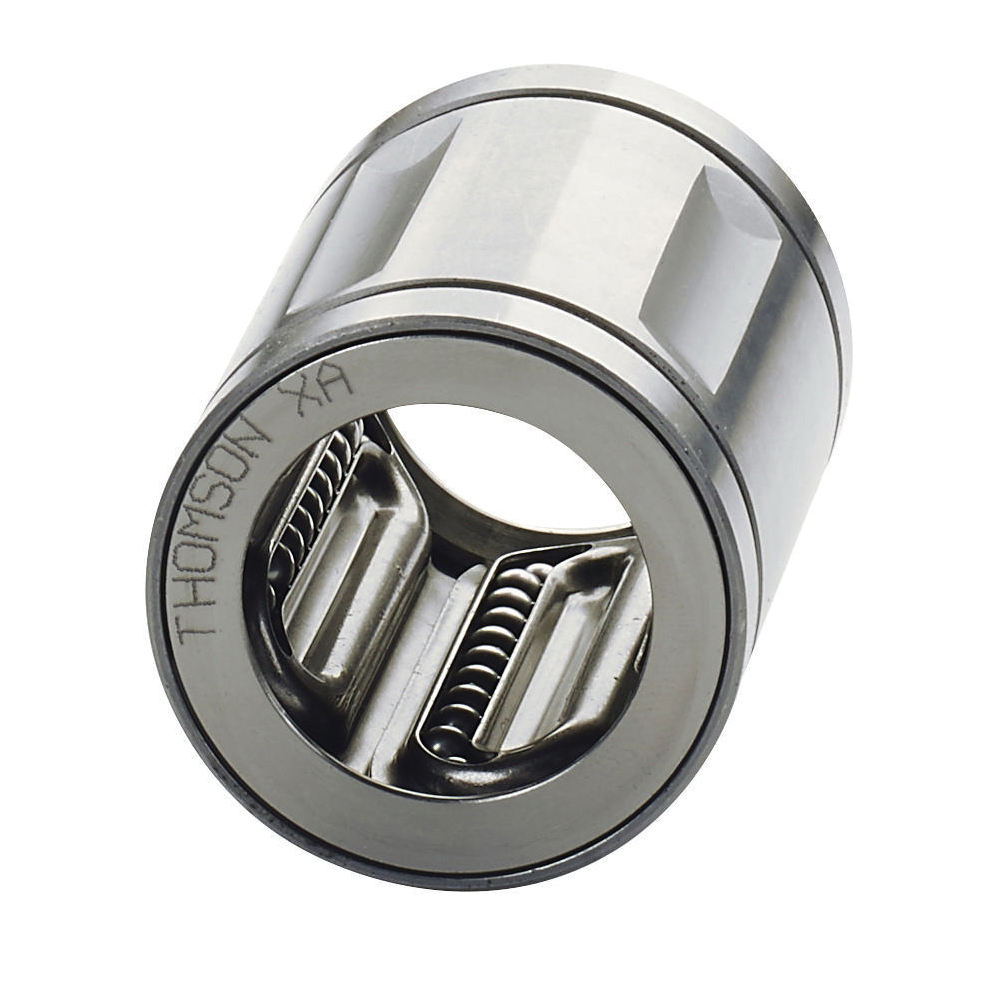 Precision Steel Ball Bushing® bearings offer great improvements in efficiency, productivity and accuracy over high-friction plain bearings flat-ways. The all-steel design makes the bearing product line perfect for replacing plain bearings in high temperature applications. Rigid construction makes them very durable compared to ball bushing bearings with polymer components. When installed in a standard Thomson® pillow block, the Precision Steel Ball Bushing® bearing can self-align up to 3 deg in all directions.