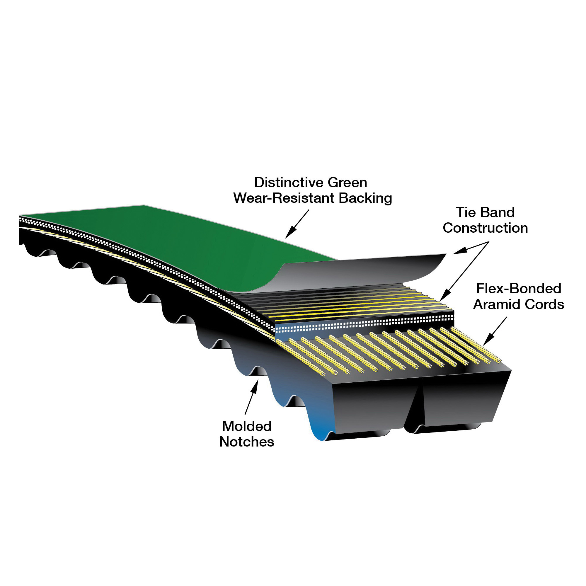 Introducing Gates® new patented high performance molded notch PowerBand® V-belt. Transmits an average 50% more horsepower than our standard Super HC® molded notch PowerBand® belts, which helps reduce the overall drive width, weight and cost. The PowerBand® construction allows multiple belts to function as a single unit, with even load distribution and each strand fitting securely in the sheave groove.