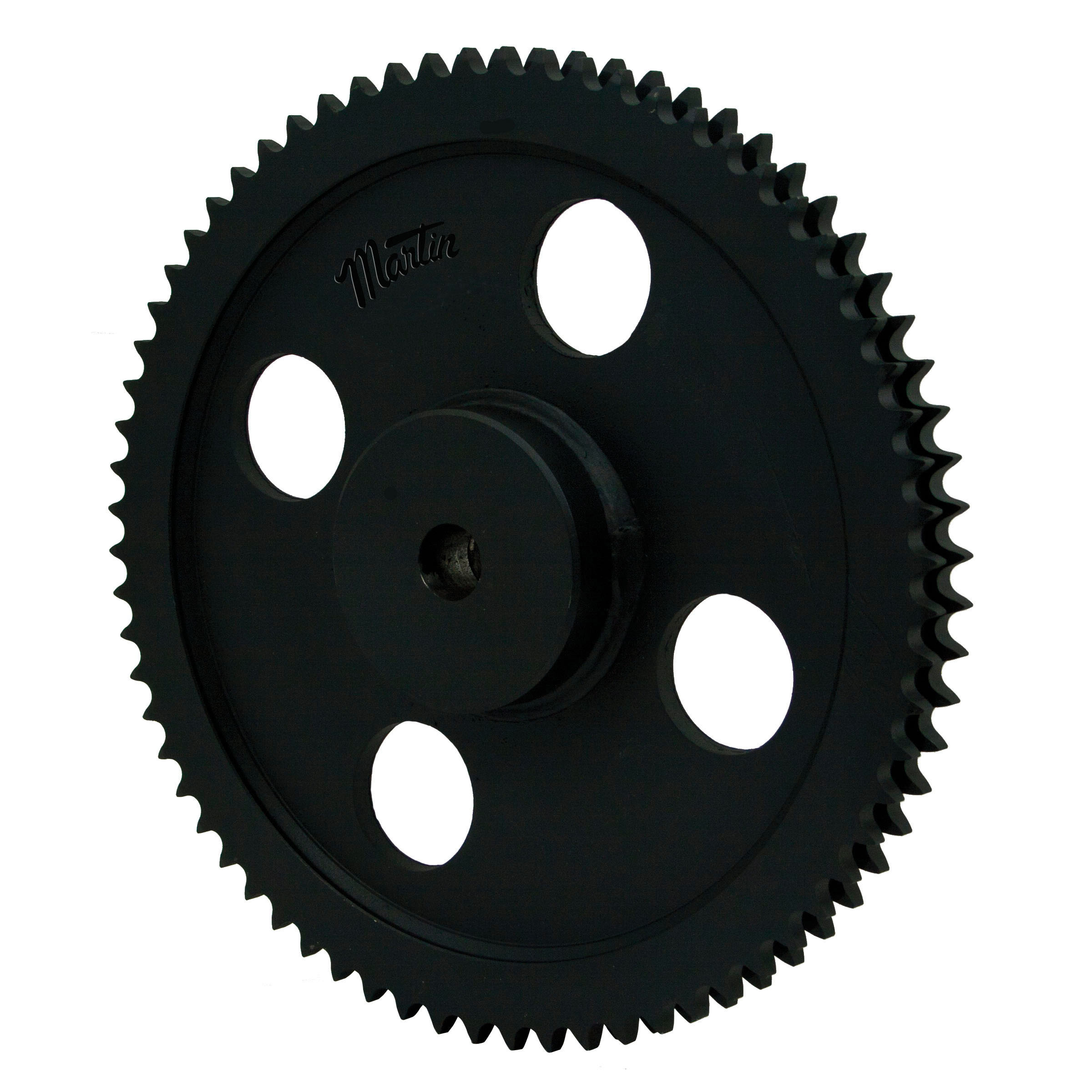 Martin double strand solid construction sprockets have proper spacing between chain rows. The sprockets are manufactured from high carbon steel. Martin does not stack "A" plates on multiples, but instead Martin machines teeth after the chain rows are already in place. These plain bore sprockets can easily be bored to a metric or standard size to fit your application. Keyways, setscrews and harden teeth are quick alterations that can be made.